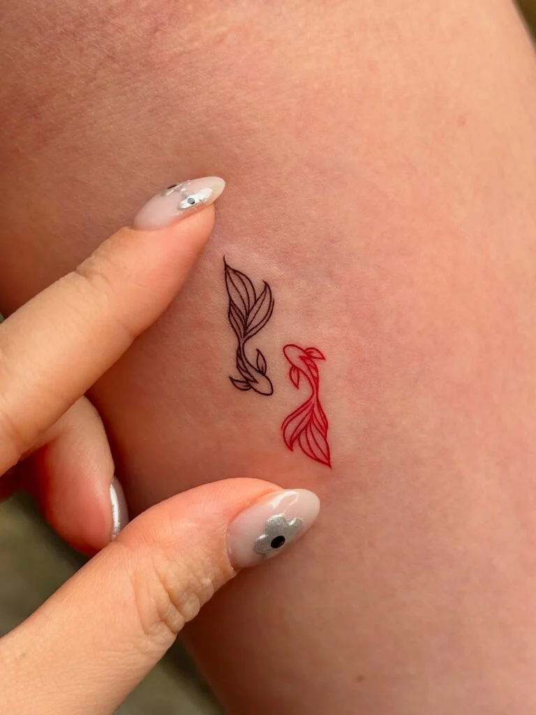 The use of both black and red ink creates contrast, making the tattoo eye-catching and vibrant. It’s a meaningful tribute to sibling love, highlighting the unbreakable connection between sisters. Positioned on the wrist, it serves as a constant reminder of support and shared memories. Perfect for siblings who want matching tattoos or a personal dedication, this design is both affectionate and artistically expressive.