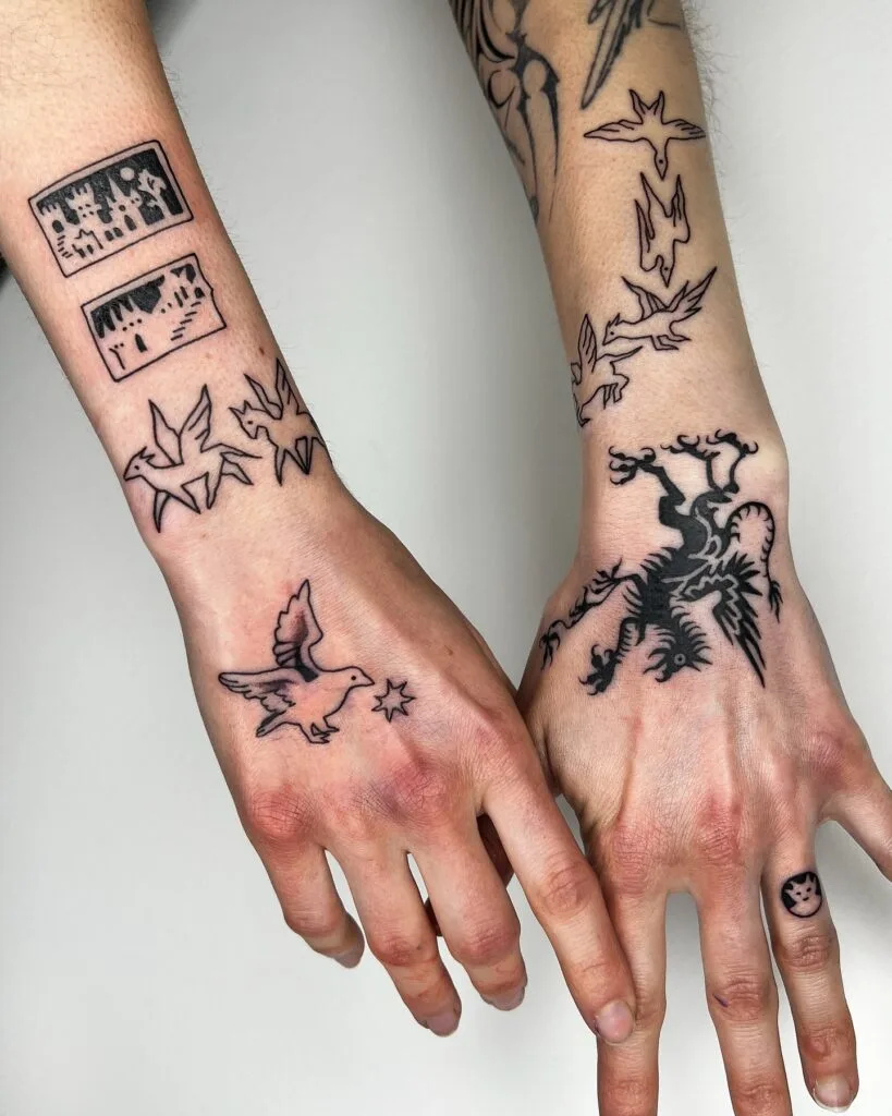 These hands showcase a series of linework tattoos featuring birds, stars, and abstract figures. On one hand, a dove carries a small star, symbolizing peace and hope. The other hand displays more dynamic bird outlines alongside abstract imagery that hints at personal storytelling or cultural symbolism.