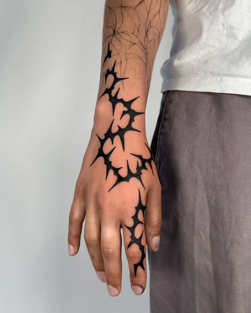 This bold tattoo extends from the palm to the fingers, with sharp, star-like black spikes radiating outward. Its placement makes it especially daring, since palm tattoos are notorious for pain and fading, highlighting the wearer’s commitment to bold ink.