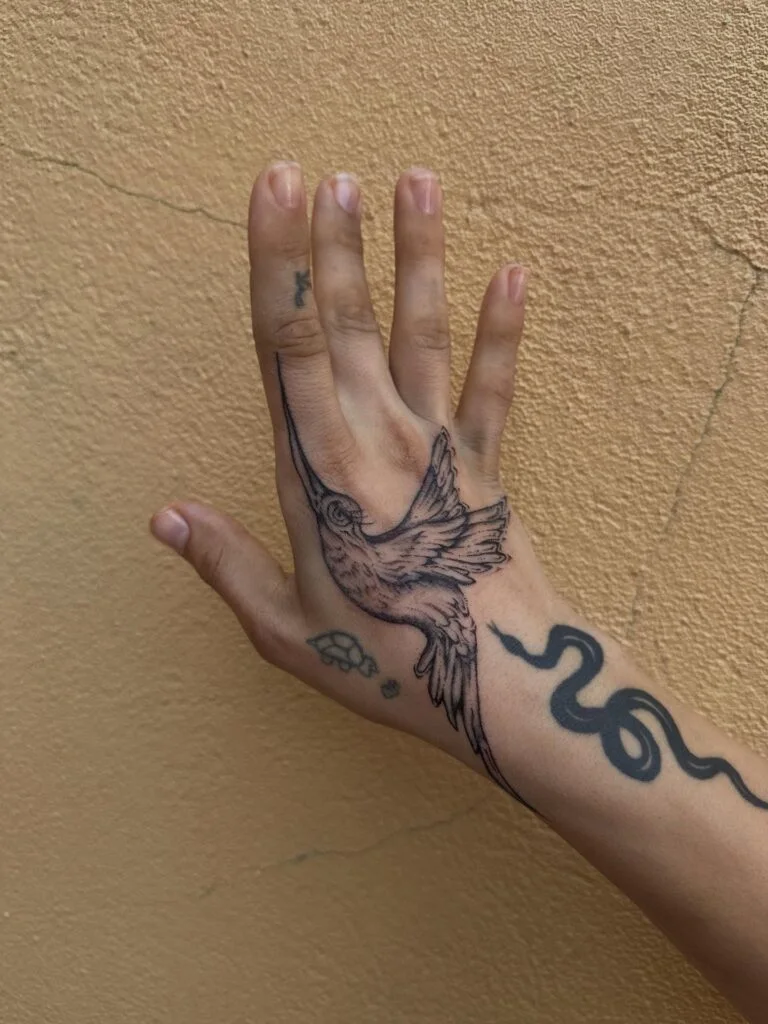 Hummingbirds often symbolize energy, joy, and resilience—tiny yet powerful creatures that thrive against the odds. Its placement across the hand and fingers emphasizes lightness and movement, making it look as if the bird is hovering in real life. This design suits someone who values nature, positivity, and the beauty of subtle tattoos with deep meaning.