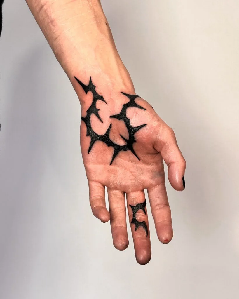 This bold tattoo extends from the palm to the fingers, with sharp, star-like black spikes radiating outward. Its placement makes it especially daring, since palm tattoos are notorious for pain and fading, highlighting the wearer’s commitment to bold ink.