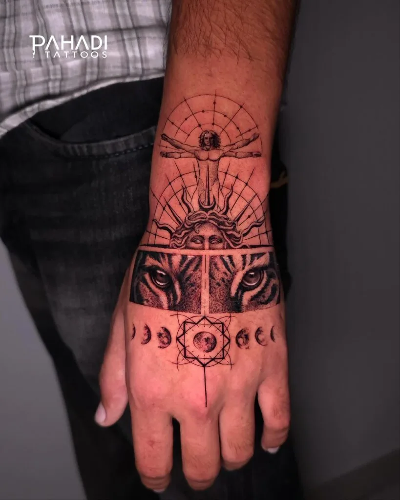 This tattoo blends sacred geometry, spirituality, and raw animal energy into one mesmerizing design. At the wrist, a Vitruvian Man symbolizes balance and human potential. Below it, piercing tiger eyes stare out with intensity, framed by geometric shapes and lunar phases that represent cycles and cosmic alignment.