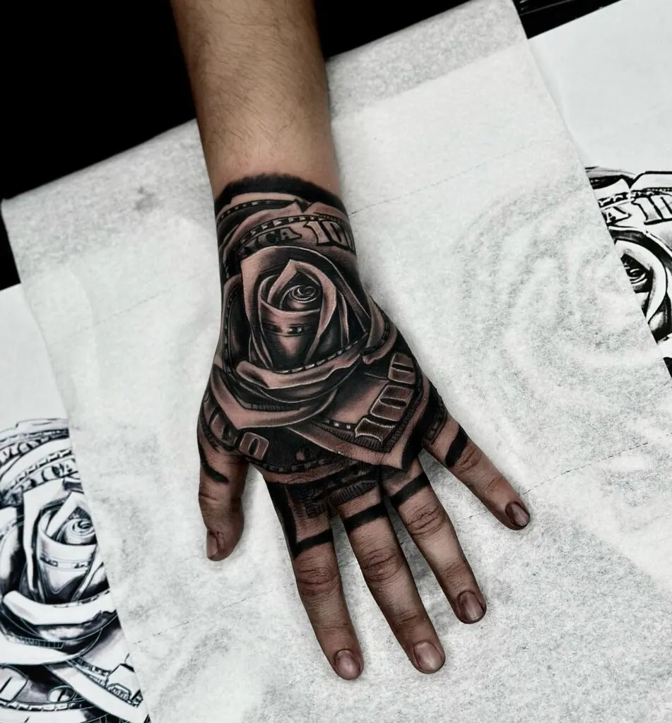 Positioned on the hand, it’s always visible, serving as a constant reminder of hustle and success. The intricate shading makes the rose almost three-dimensional, blending luxury with artistry. This tattoo is perfect for someone who values both symbolism and striking realism in their body art.
