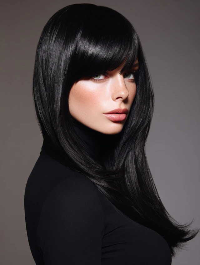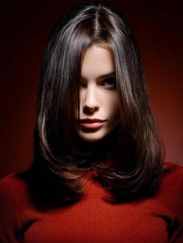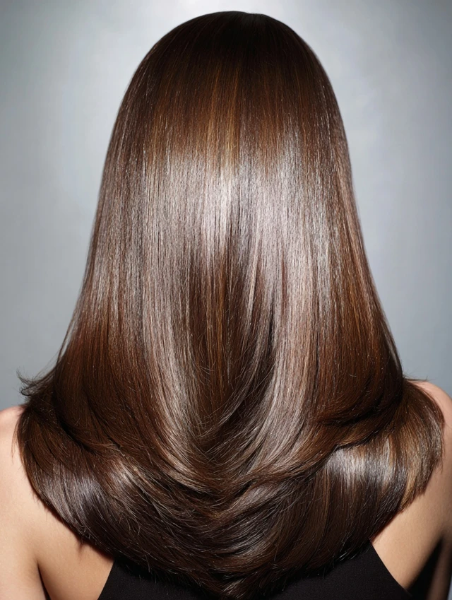 Sleek hair with outward-flipped ends embodies classic 70s style while staying modern.