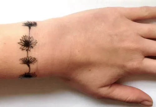 A daisy chain tattoo symbolizes innocence, purity, and new beginnings. Daisies are often seen as symbols of fresh starts and happiness. The design, typically featuring a series of small daisies linked together, represents unity, friendship, and a connection to nature. This tattoo can be placed around the wrist or ankle like a bracelet or wrapped gently around the arm. Its playful yet chic aesthetic makes it perfect for those who want a lighthearted yet meaningful design.