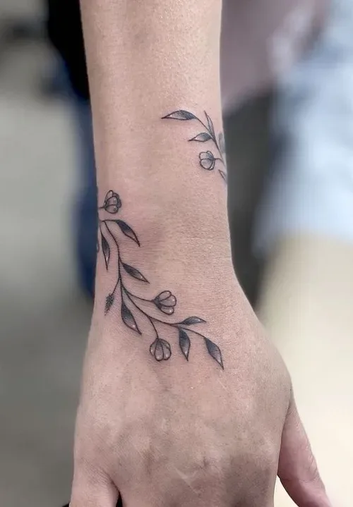 A delicate vine wrapping around the wrist symbolizes growth, connection, and the beauty of nature’s cycles. The vine often represents life’s continuous flow, resilience, and the importance of being grounded. When designed with fine, minimalist lines, the vine creates a subtle yet sophisticated look. This tattoo placement on the wrist makes it a personal and intimate design, worn as a constant reminder of one’s journey or growth. It’s ideal for those who appreciate nature and the symbolism of interconnectedness.