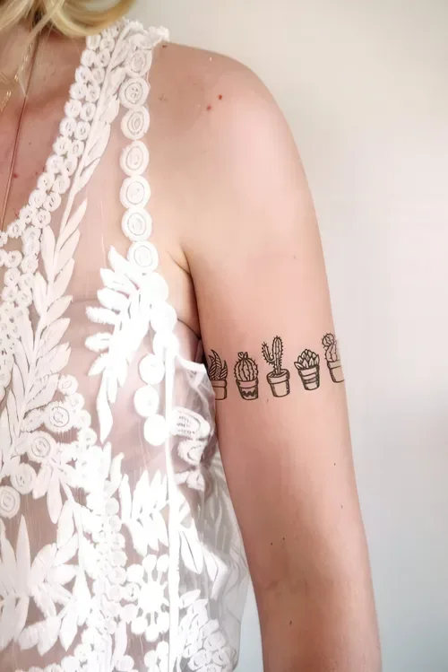 A tiny cactus tattoo symbolizes resilience, strength, and the ability to thrive in difficult environments. Cacti are known for surviving harsh conditions, and as a tattoo, they represent endurance, independence, and personal growth. The minimalist design emphasizes the unique shape of the cactus, often with just a few lines to outline its form. It’s an ideal tattoo for those who appreciate nature’s ability to flourish even in adversity. Common placements include the wrist, ankle, or behind the ear, where the design is both subtle and meaningful.