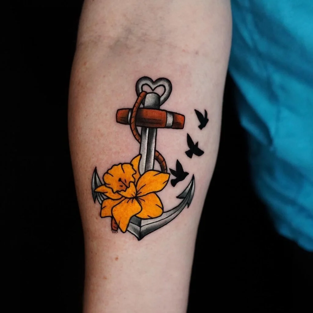 This bold design combines a grey anchor with a bright yellow flower at its base and small black birds flying around it. The color contrast makes the flower pop, symbolizing happiness, hope, and growth alongside the anchor’s stability.