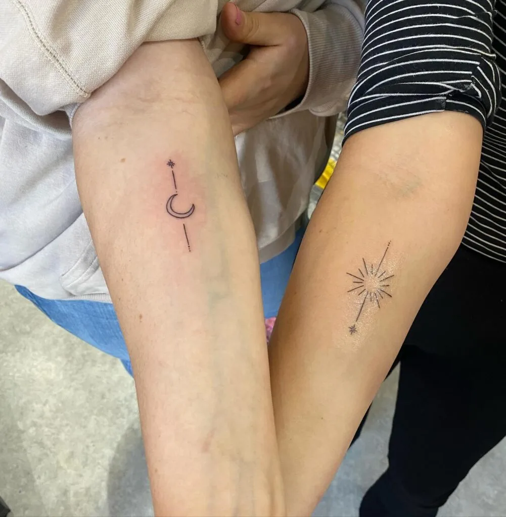 Matching tattoos are identical—like twin symbols or mirrored phrases. Complementary tattoos are more creative: one of you gets the sun, the other the moon; one gets a key, the other a lock. Think about what suits your dynamic best. You don’t have to match perfectly to represent harmony.