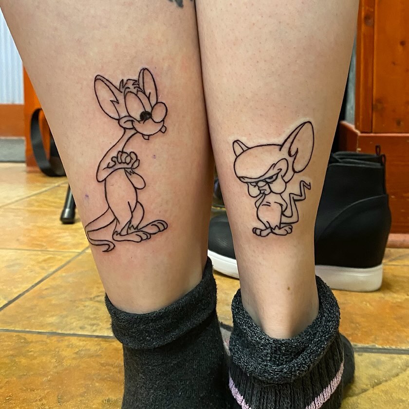 This tattoo set features the iconic cartoon characters, Pinky and the Brain, representing the dynamic of a fun, mischievous, and adventurous friendship. With simple yet expressive line art, the tattoos capture the personalities of both friends—one being the spontaneous, carefree type, and the other being the mastermind with big plans. Perfect for best friends who have an unbreakable bond filled with humor and nostalgia, this tattoo set is a playful way to showcase your unique connection.