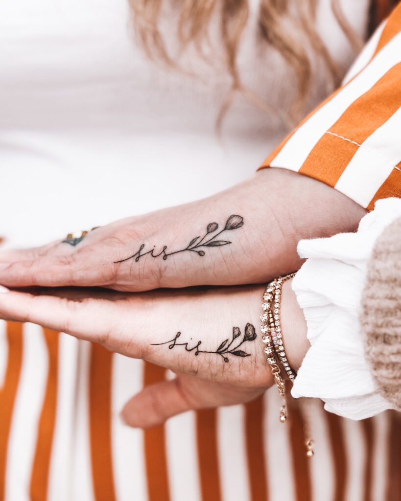 These matching wrist tattoos feature the word “sis” in delicate cursive, intertwined with minimalist botanical elements. This design is a perfect tribute to sisterly bonds, whether through blood or chosen family. The placement on the hands ensures that this meaningful tattoo is always visible, serving as a constant reminder of an unbreakable connection. The simplicity of the design adds elegance, making it a timeless and stylish choice for best friends who consider each other as sisters.