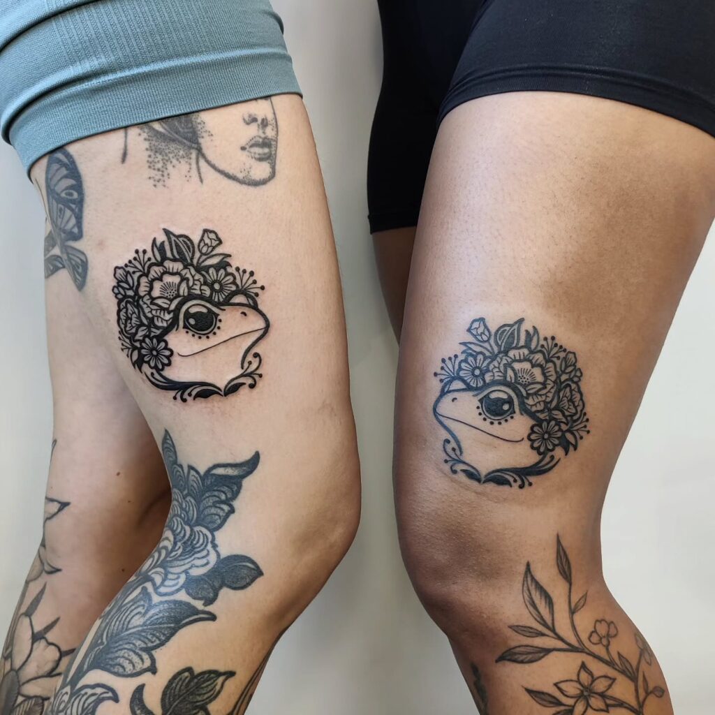 This matching tattoo set features a beautifully illustrated frog with floral adornments, symbolizing transformation and deep connection. The fine-line black ink work adds a delicate yet bold touch to the design. Placed on the thighs, these tattoos are a testament to a friendship that is both fun and enduring, much like the symbolic nature of the frog—resilient and adaptive. The floral elements add a touch of softness, representing the beauty that blossoms in long-lasting friendships. This tattoo is perfect for best friends who appreciate art, nature, and deep symbolism.