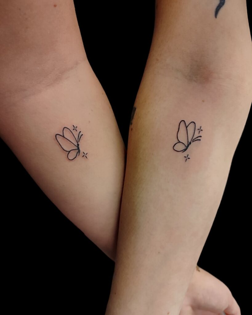 These matching butterfly tattoos embody transformation and freedom, perfectly capturing the essence of a friendship that evolves over time. The fine-line design is minimalistic yet meaningful, making it a subtle yet powerful statement. Placed on the forearm, the tattoos serve as a gentle reminder of the uplifting and transformative power of friendship. The tiny sparkles surrounding the butterfly enhance the ethereal effect, making it an ideal tattoo choice for best friends who share a bond of growth, lightness, and positivity.