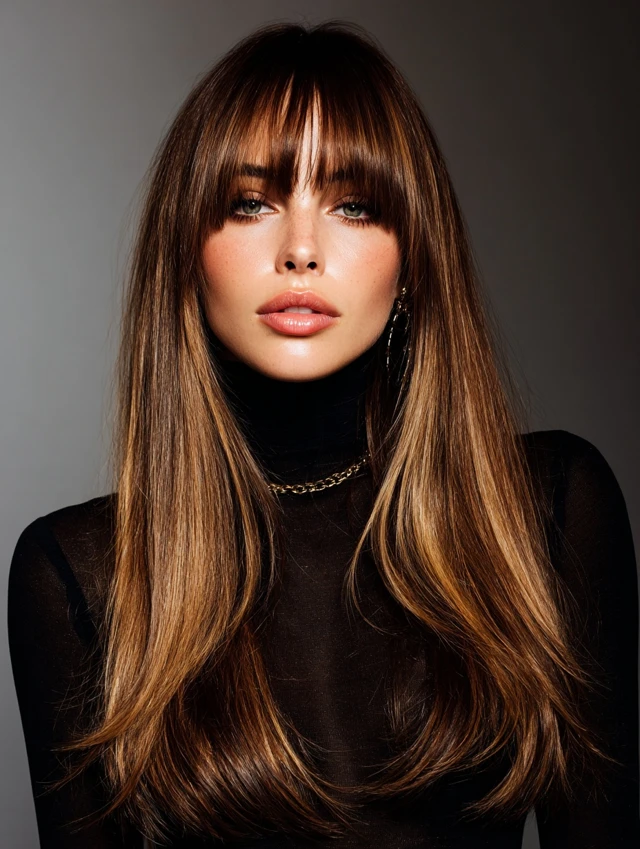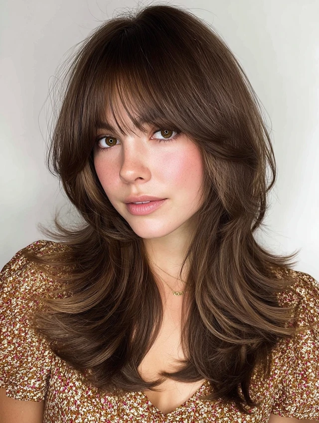 Curtain bangs blend seamlessly into butterfly layers, enhancing the feathered, romantic shape.
