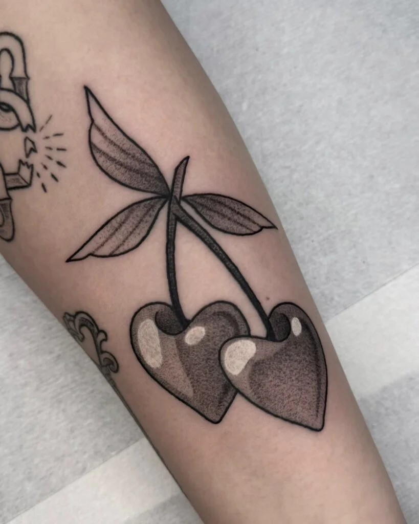 This tattoo reimagines cherries as heart shapes, shaded in smooth black and gray with bold outlines. The leaves are detailed with soft dotwork shading, adding texture and elegance to the piece.