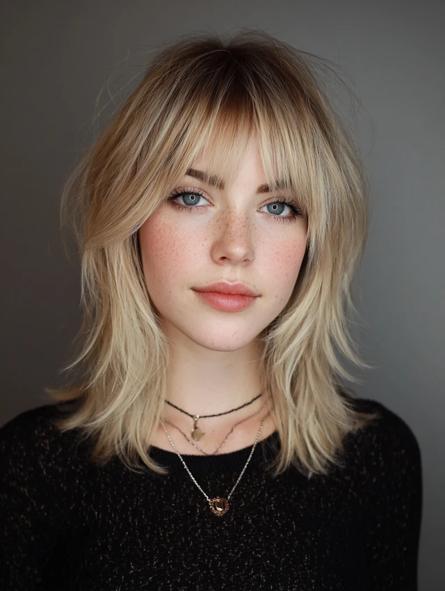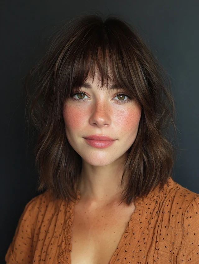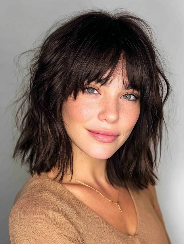 Shag layers and curtain bangs create fullness, softness, and trendy texture.