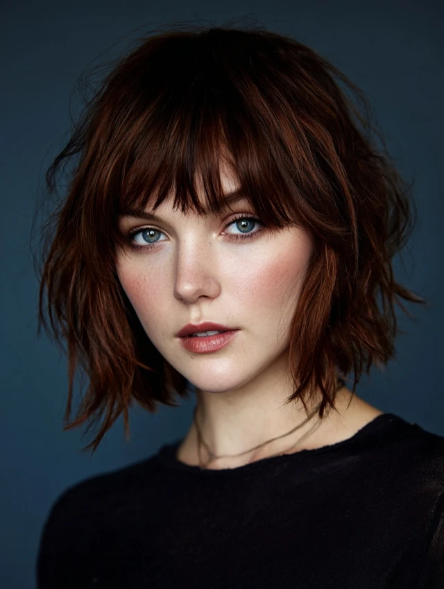 Layered bob with bangs, textured bob with fringe, choppy lob with bangs, angled bob with bangs, or shaggy bob with bangs.
