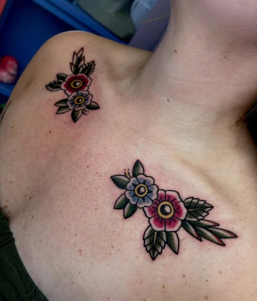 This vibrant design uses bold outlines and bright colors, featuring traditional-style flowers that sit gracefully near the collarbones. The combination of red, pink, and muted greens creates a playful yet nostalgic feel.