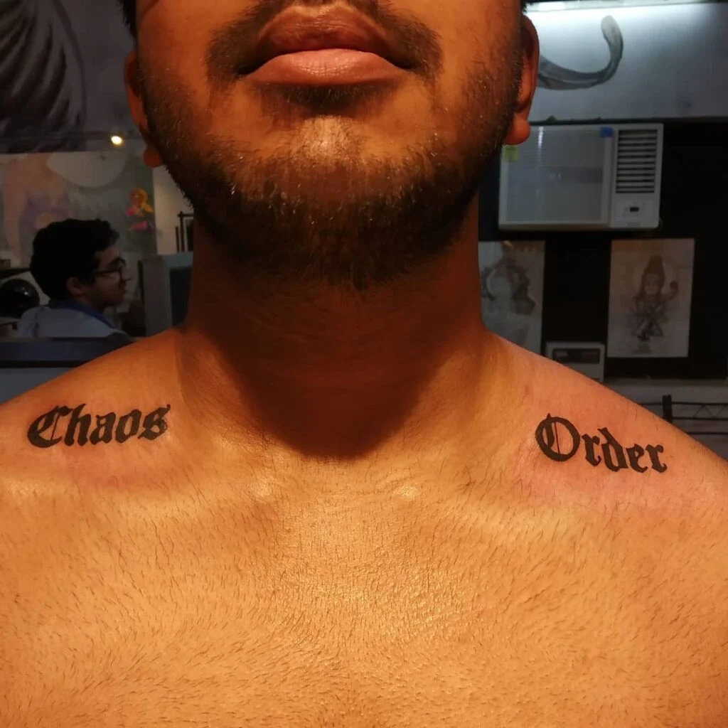 This bold lettering tattoo splits the words “Chaos” and “Order” across the collarbones. The Gothic-style script gives it a strong, impactful presence and draws attention to the message it carries.