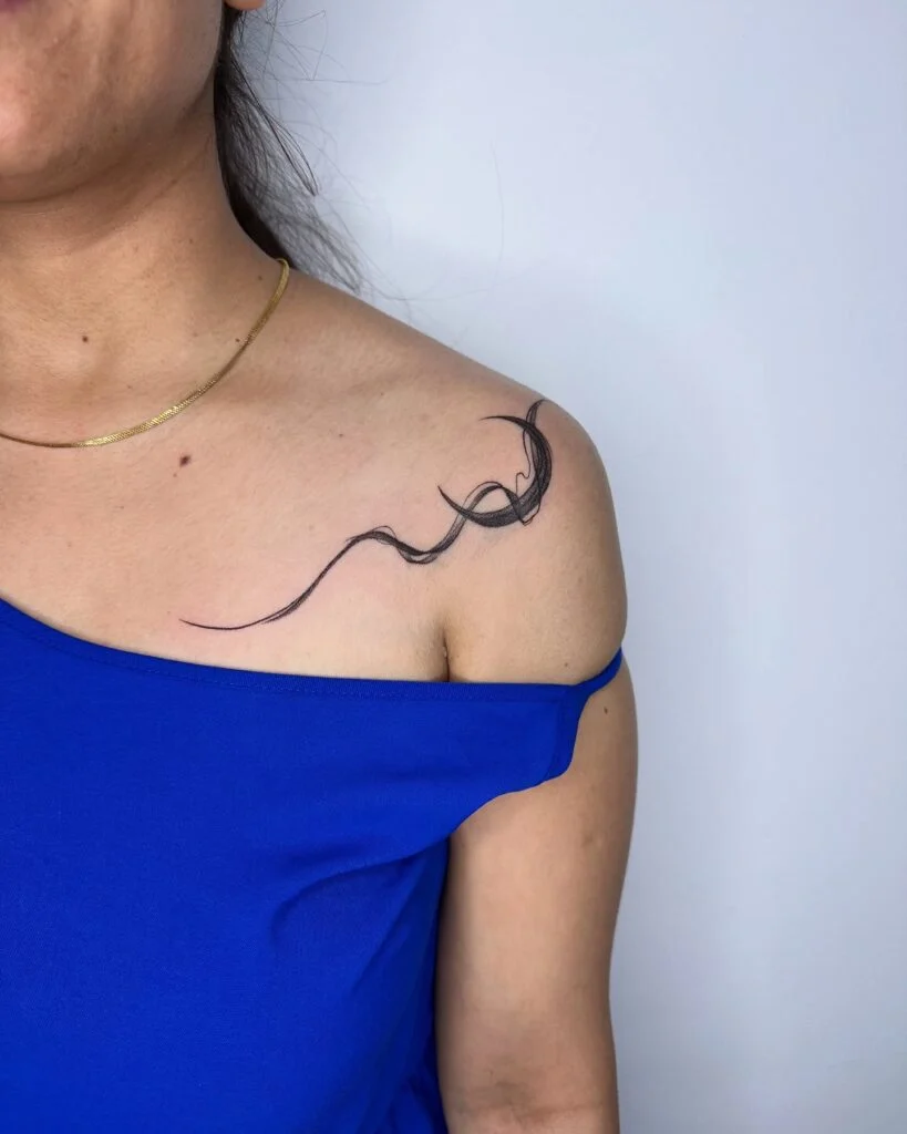 This piece takes a modern, abstract approach with a single flowing black brushstroke that dances across the collarbone. Its minimal style gives it a clean, effortless look while maintaining a sense of motion.