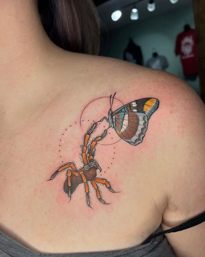 This unique tattoo pairs a realistic spider with a colorful butterfly, creating a compelling balance between dark and light imagery. The fine linework and delicate dots add detail, pulling the design together beautifully.
