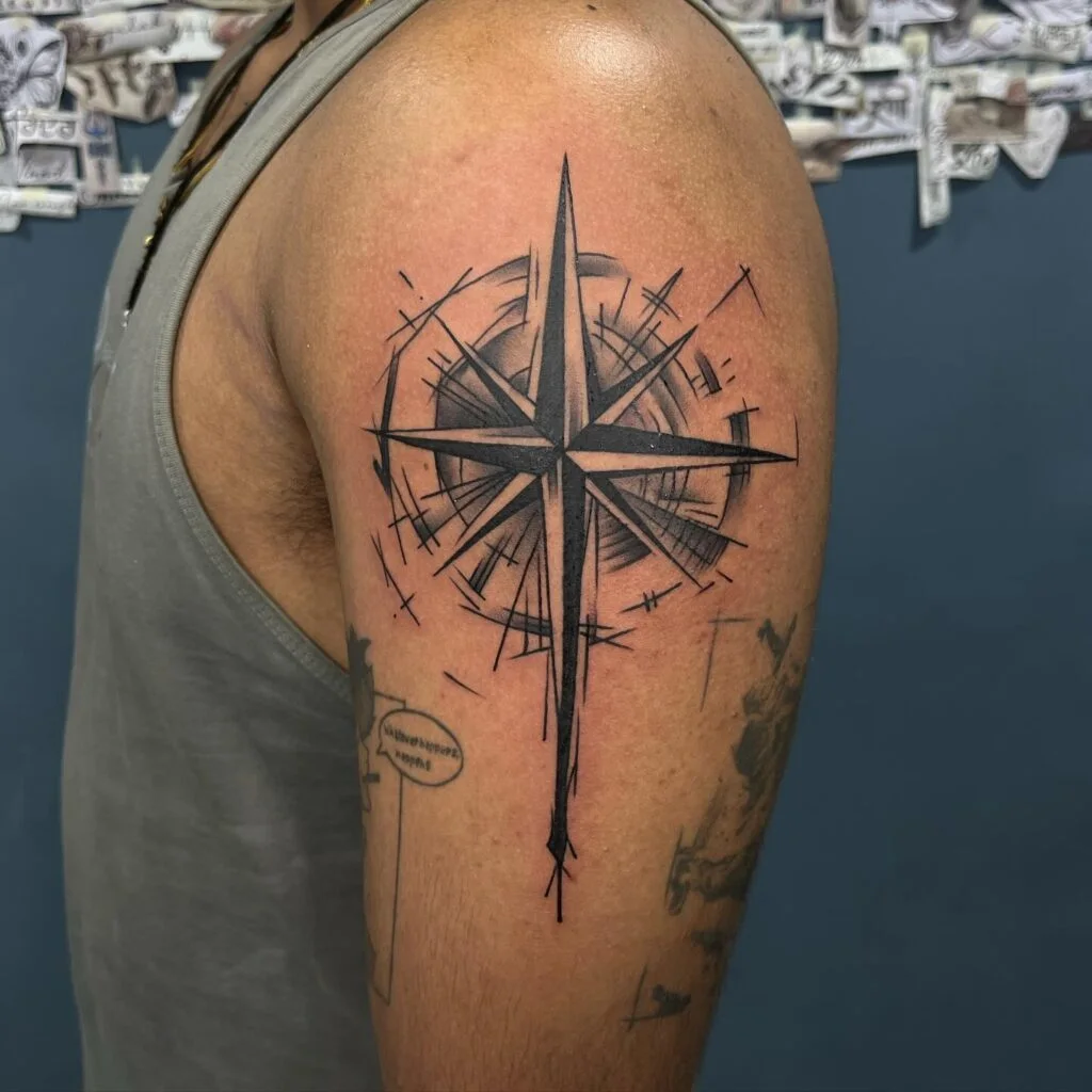 This tattoo features a sketch-style compass with rough, dynamic lines that give it an artistic, almost hand-drawn feel. The shading adds depth, making the compass appear like it’s in motion, which symbolizes a constant search for direction in life.