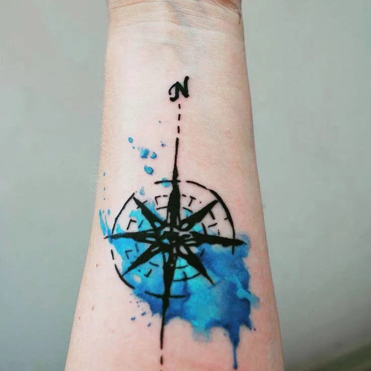 This forearm compass tattoo pops with vivid blue watercolor splashes that create a sense of oceanic adventure. The black compass lines stand in contrast, drawing focus to the direction and navigation theme. The dotted line leading to the “N” adds a playful, illustrative feel to the piece.