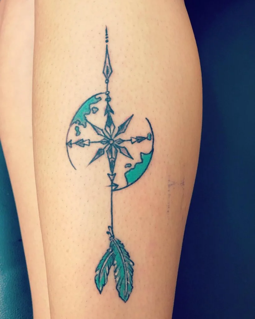 This design combines a compass rose with a crescent moon and dangling feathers, giving it a delicate and mystical look. The use of thin lines and teal highlights creates a sense of freedom and movement, almost like a dreamcatcher for travelers. It’s a great tattoo for someone who loves adventure but wants something soft and feminine.