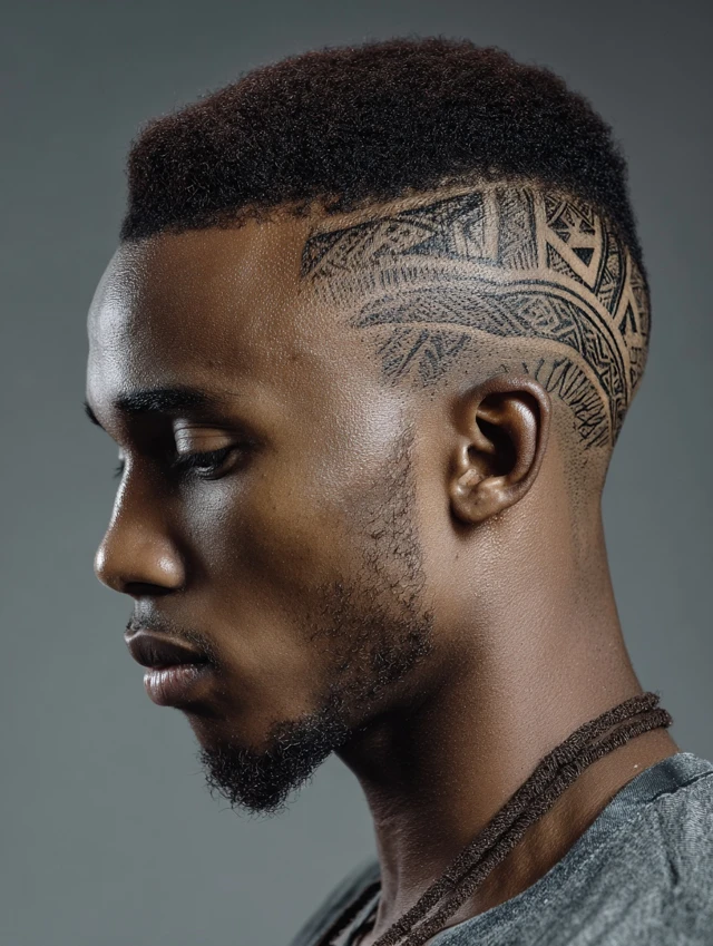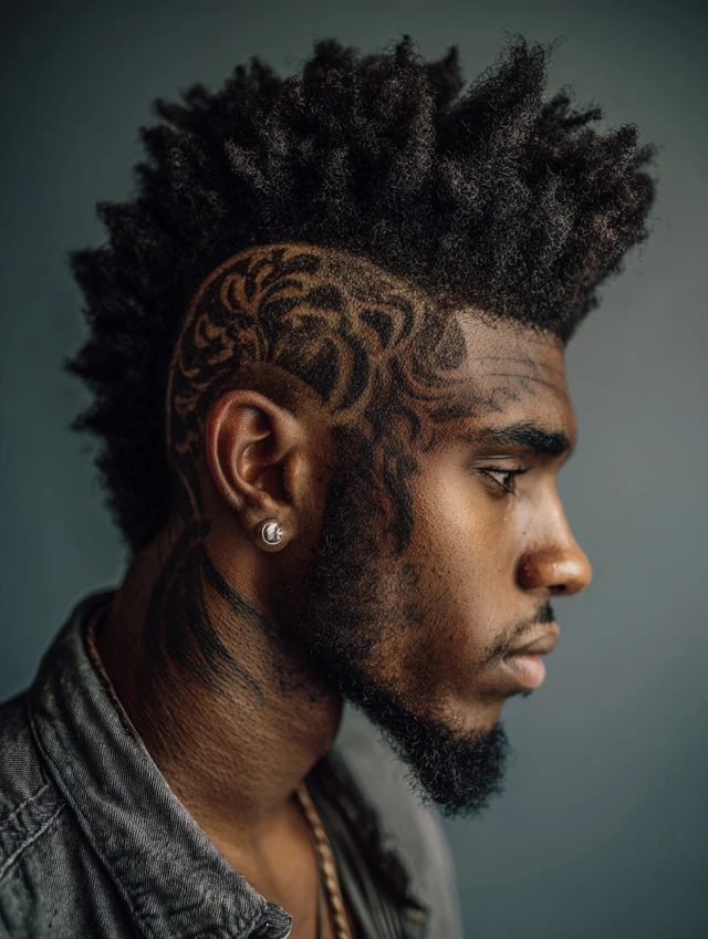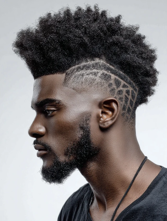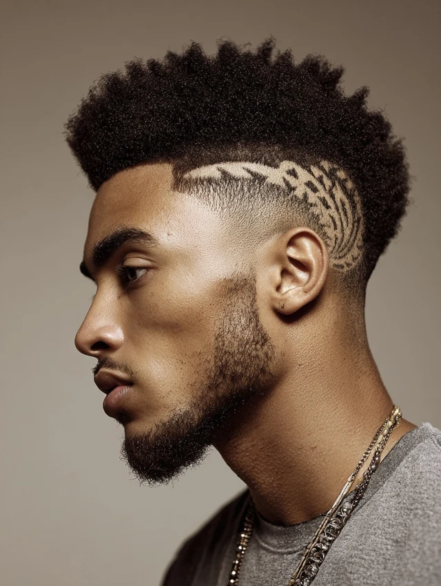 A tapered afro adds height while shaved patterns on the sides express individuality. This style is both stylish and creative.