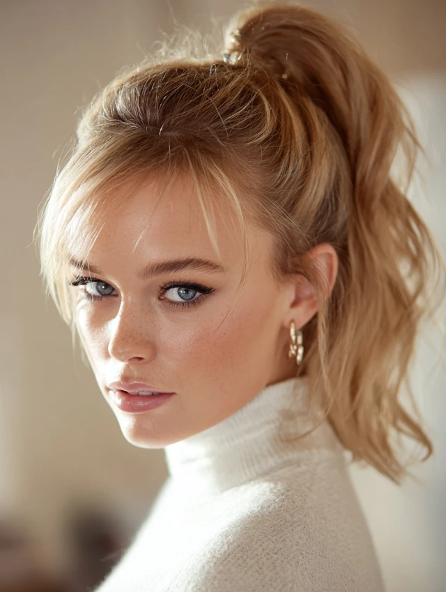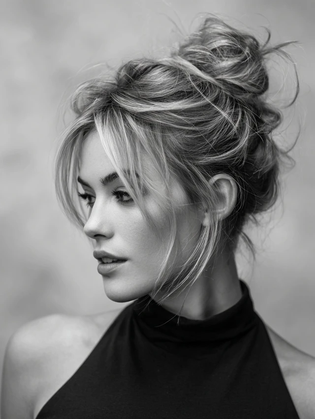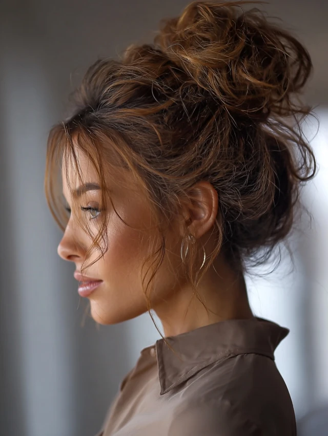 A messy bun is quick, practical, and effortlessly chic. Wispy pieces soften the face and make the look approachable.