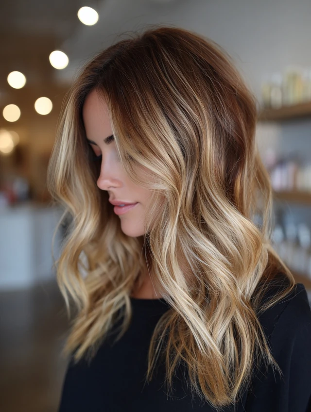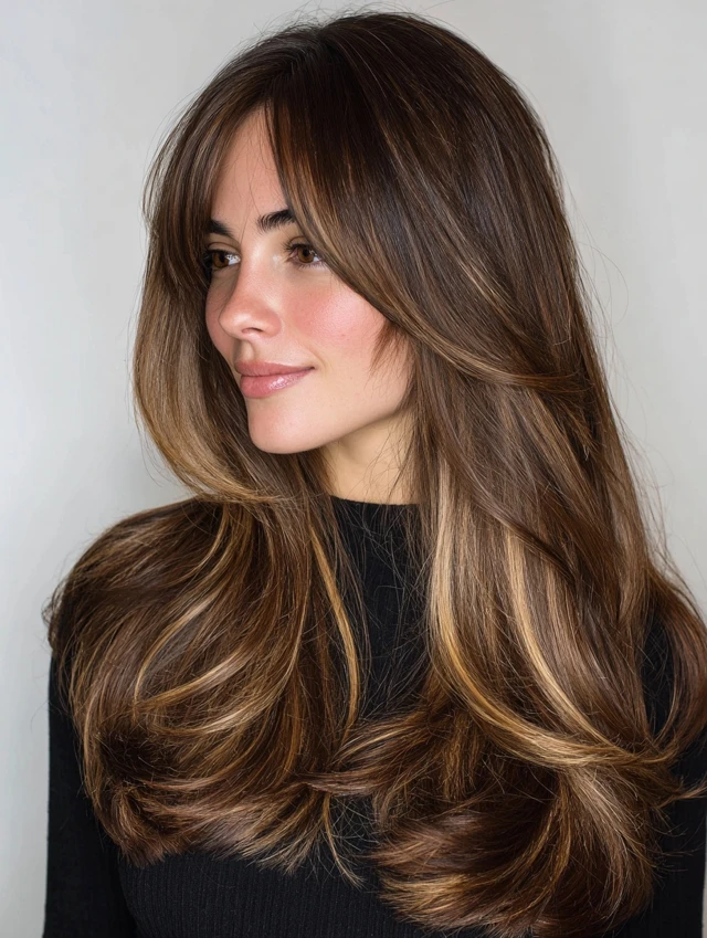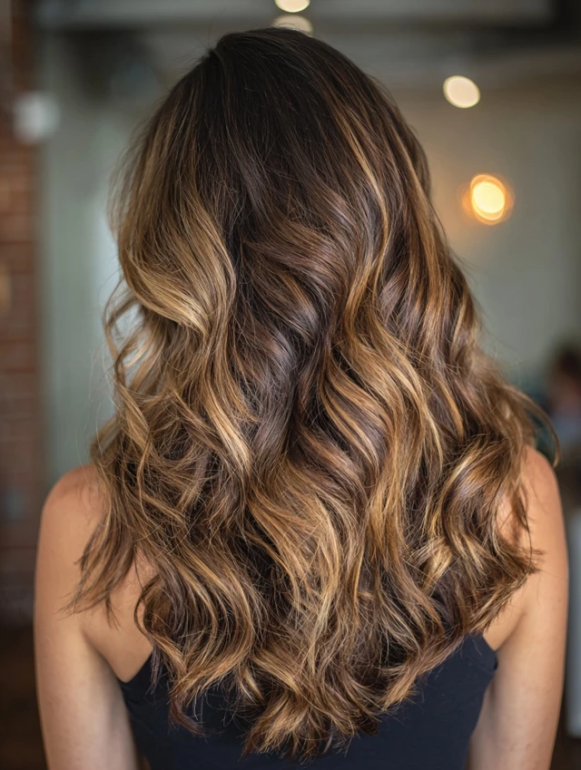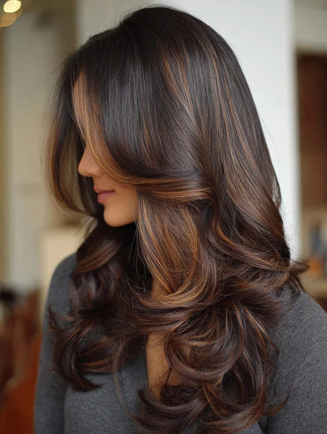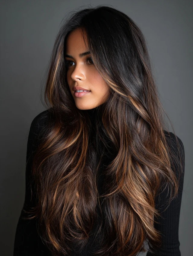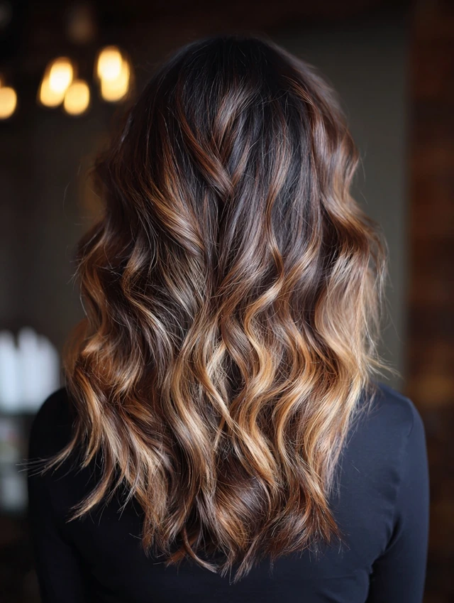 Balayage highlights blend softly, creating a sun-kissed effect even with a dark base.