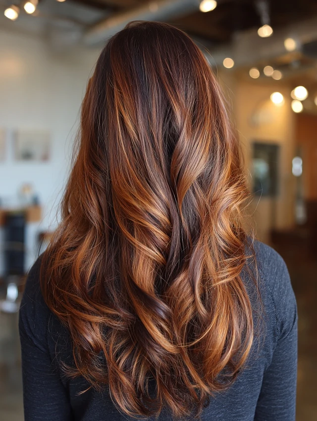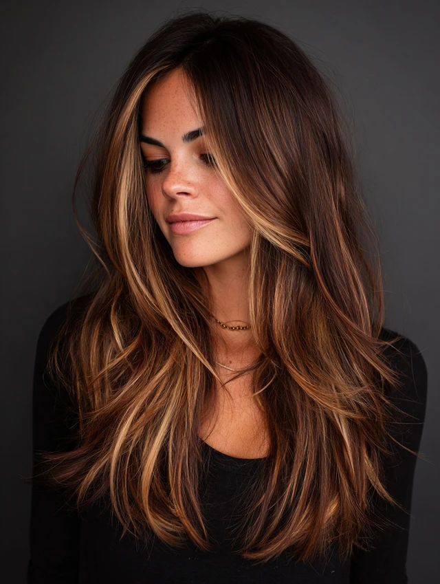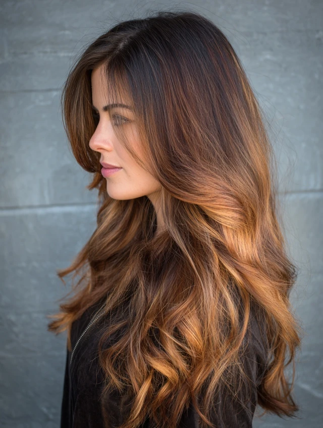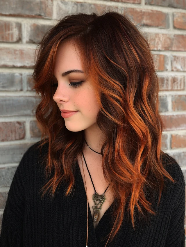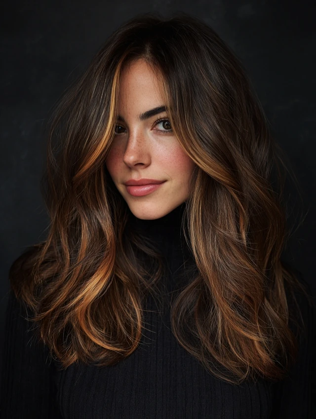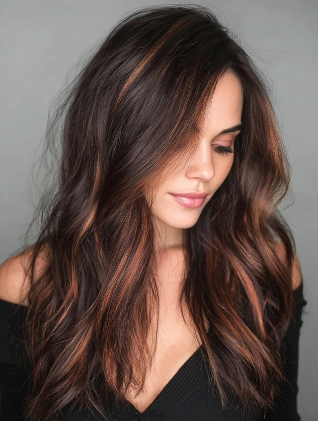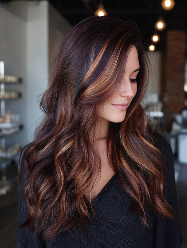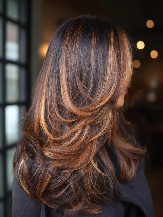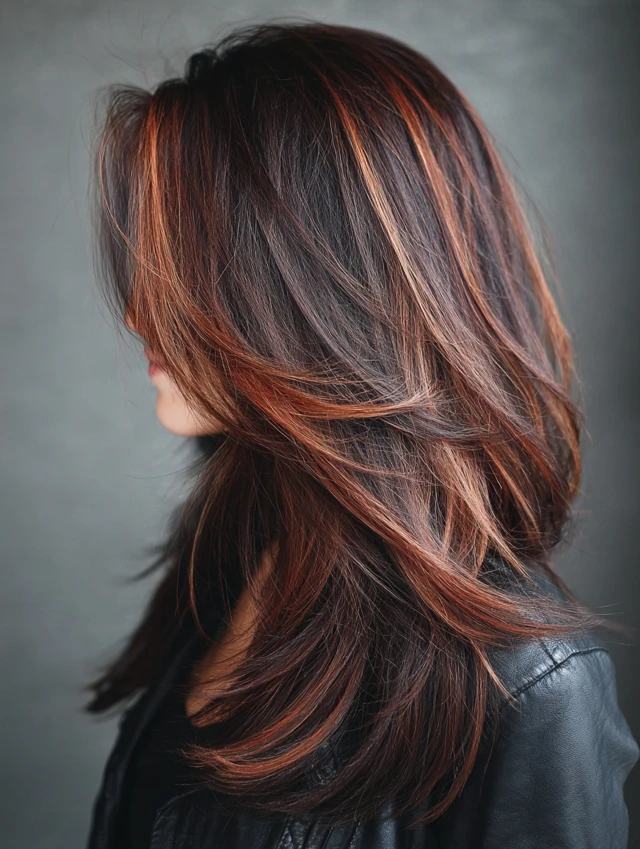 Adding subtle auburn pieces to a dark base with caramel highlights creates a rich, multi-dimensional effect that’s playful yet sophisticated.