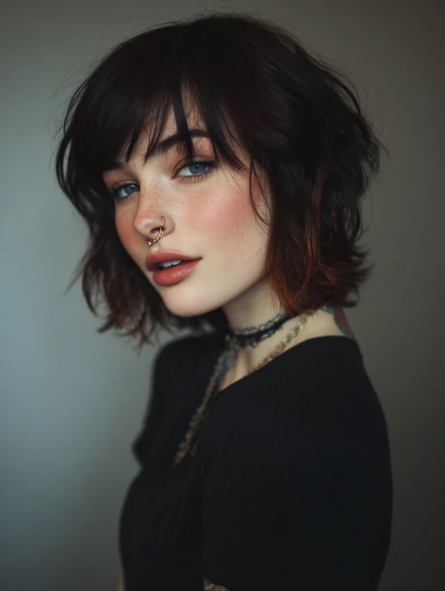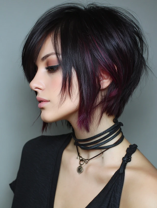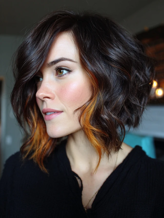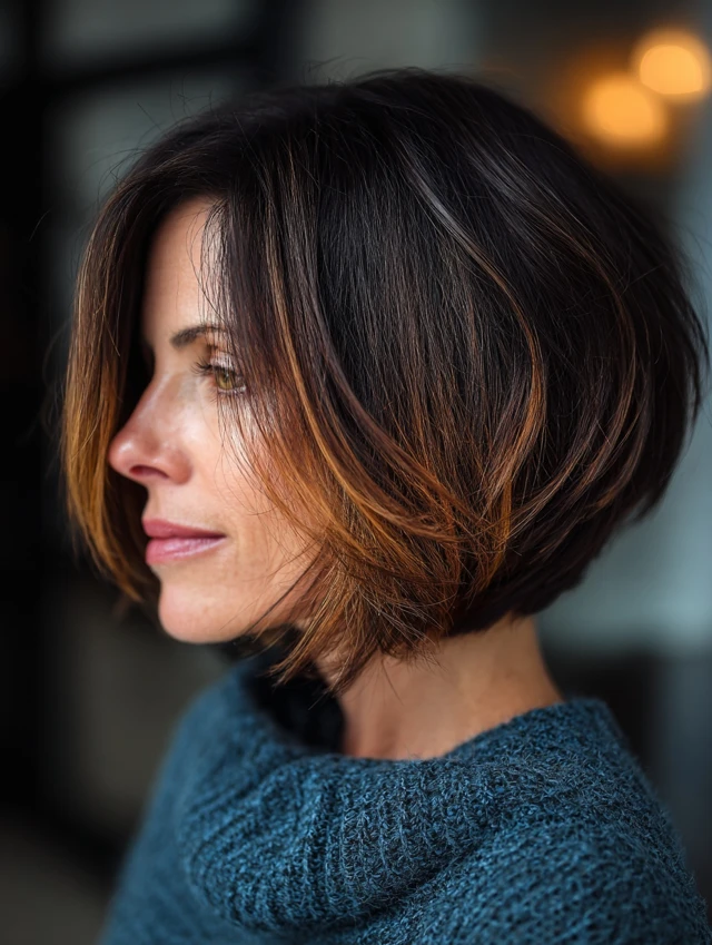 A sleek bob lets the subtle warm tones stand out against the deep base, offering a chic, modern look.