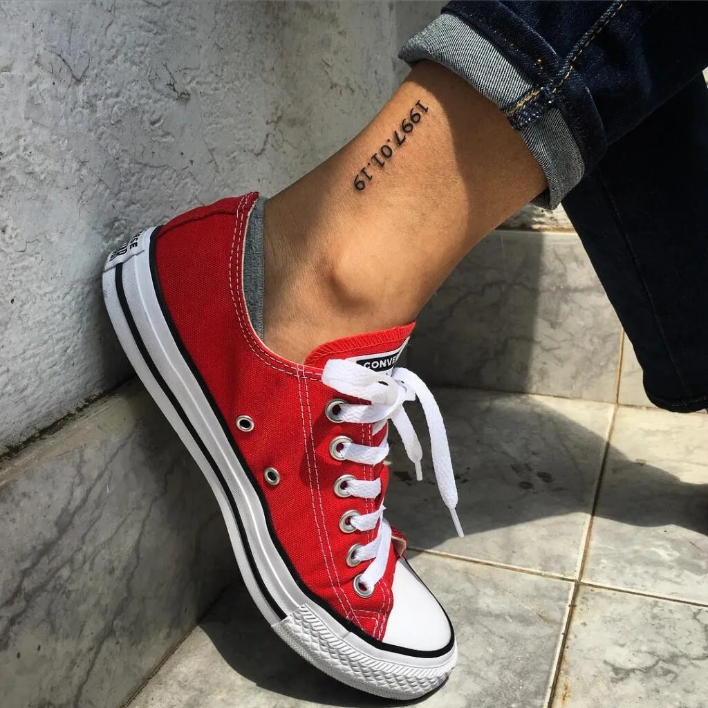This minimalist design features a date placed neatly on the ankle, a subtle yet deeply personal choice. The simplicity of the numbers ensures the focus remains on the meaning behind them.