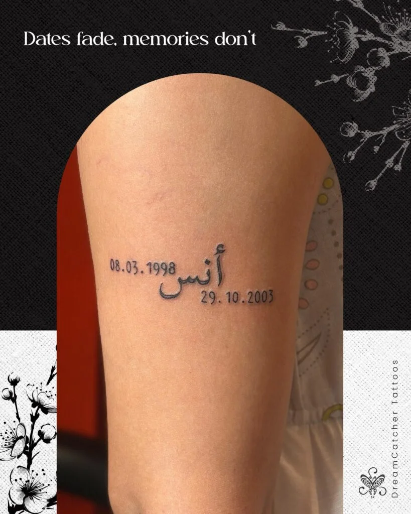 This tattoo combines two meaningful dates with an Arabic name at the center. The dates mark moments that hold deep emotional significance, while the script adds cultural and personal depth. It’s a beautiful way of blending time, memory, and identity into a single piece of art.