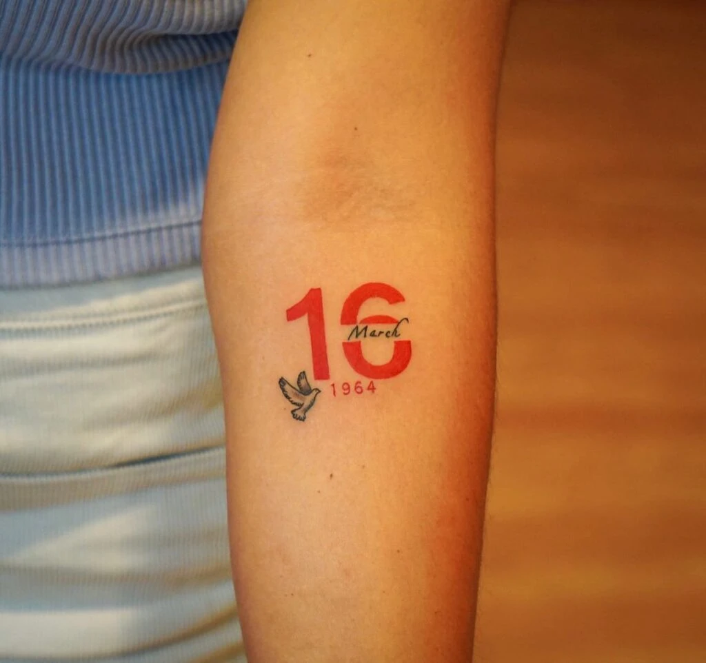 This tattoo combines bold red and black ink with the date “16 March 1964,” framed with creative typography. The large red numbers command attention, while the smaller script adds delicacy and balance.