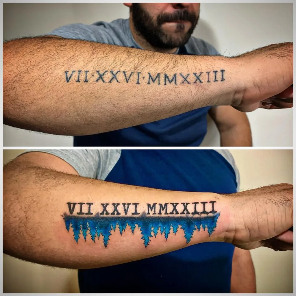 This tattoo transforms a significant date into elegant Roman numerals, stretching across the forearm for a bold look. Roman numerals add a timeless, classical touch, elevating the date into a statement piece.