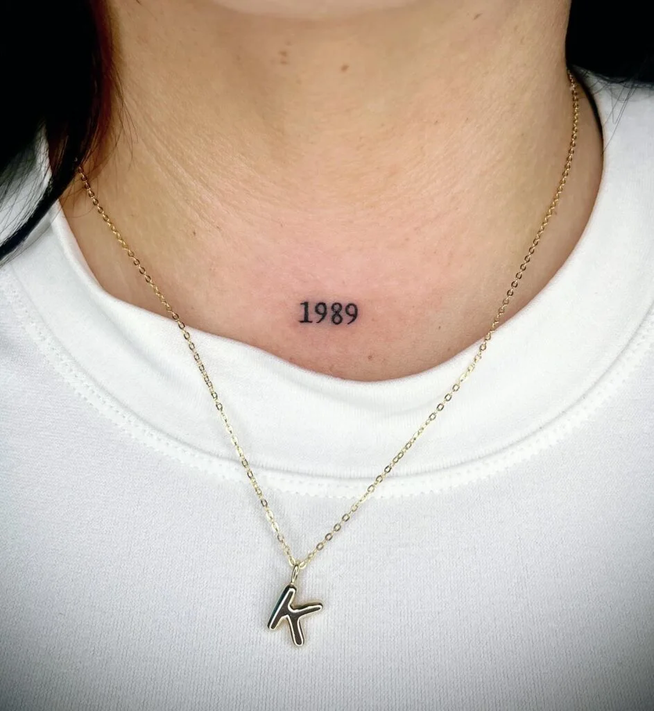 Placed just below the collarbone, this tattoo showcases the year “1989” in a bold yet simple typeface. It could symbolize the wearer’s own birth year or that of someone they hold dear, acting as a permanent marker of significance.