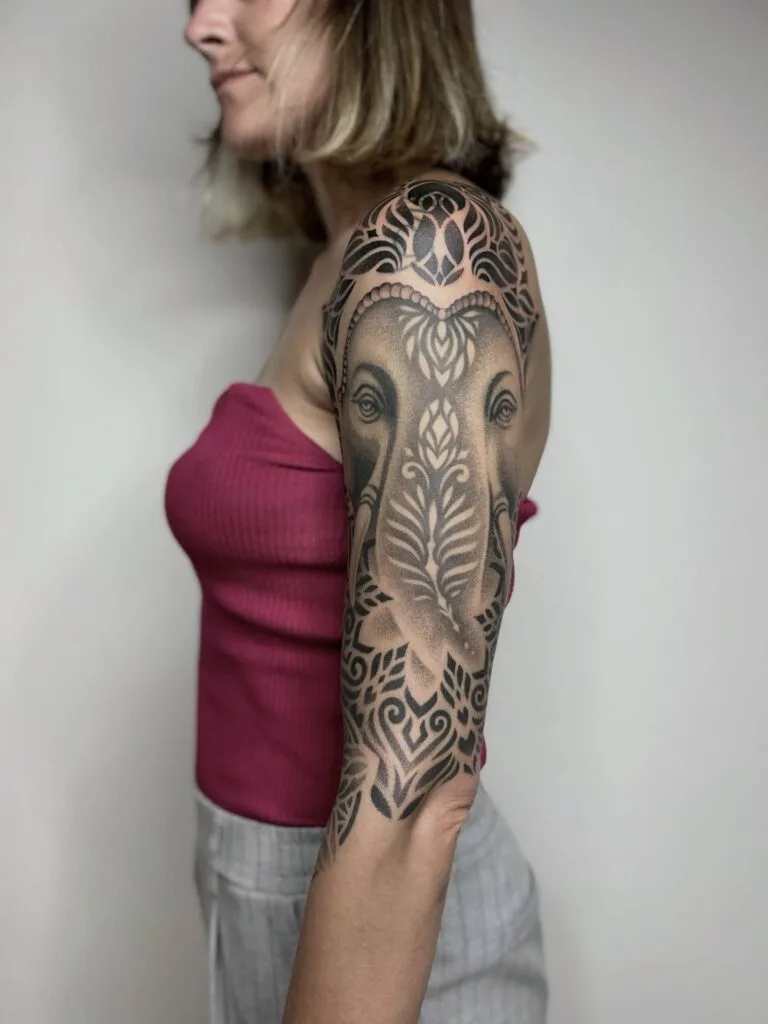 This full sleeve tattoo showcases an elephant rendered in dotwork, framed by intricate ornamental patterns. The detailing captures both the strength and serenity of the elephant, creating a majestic centerpiece.
