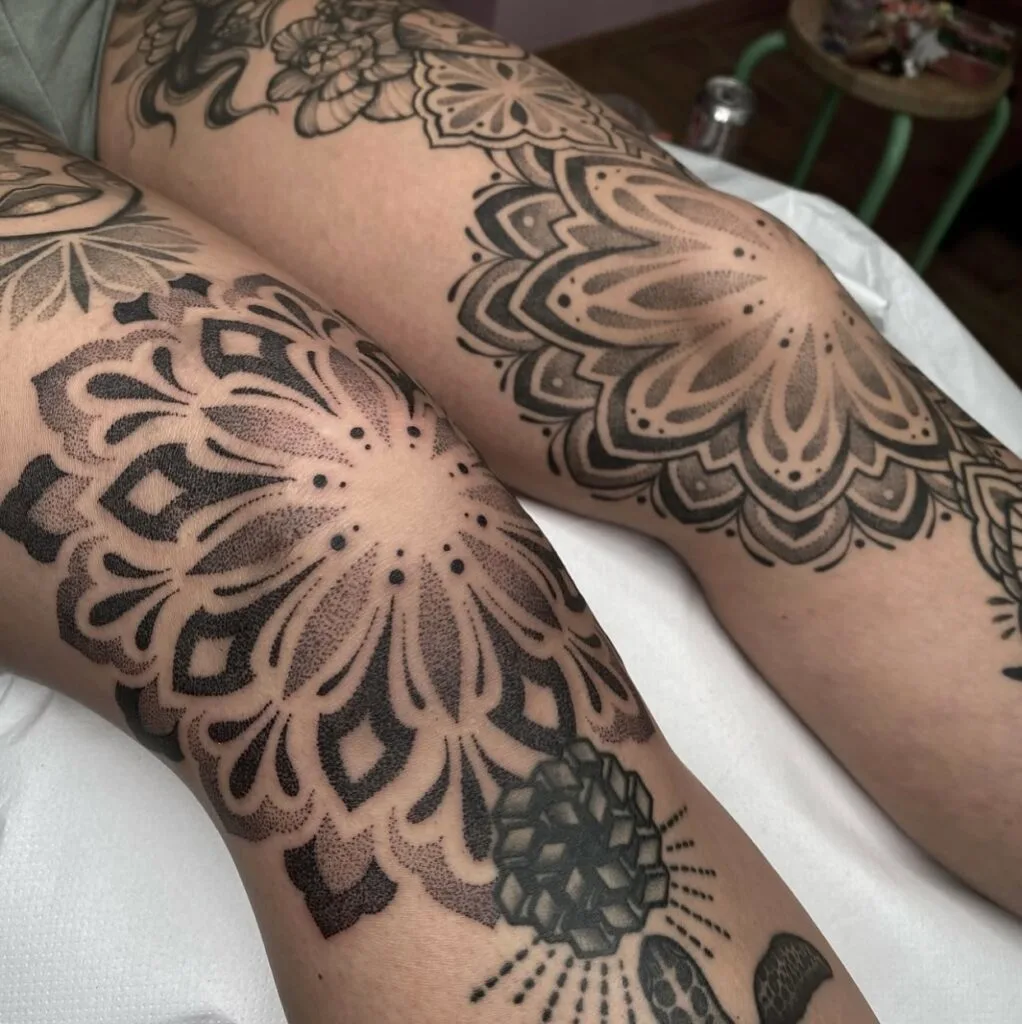 7. Symmetrical Knee Mandala Dotwork Tattoo