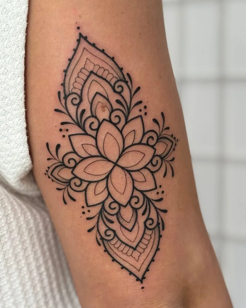 This delicate design blends floral and mandala elements, with petals arranged symmetrically to form a striking composition. The dot shading creates layers of light and dark, making the tattoo appear almost three-dimensional.