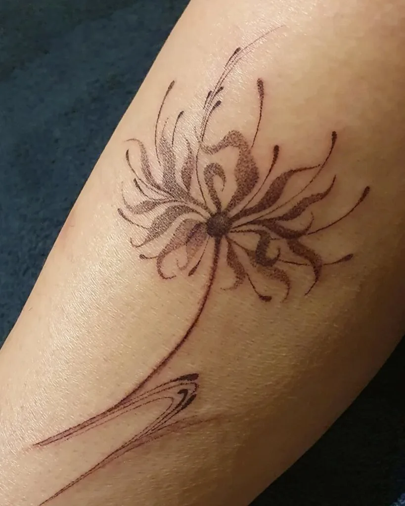 This tattoo captures the fleeting beauty of a dandelion in fine lines and subtle dot shading. The flower appears light and delicate, as if ready to be carried away by the wind.