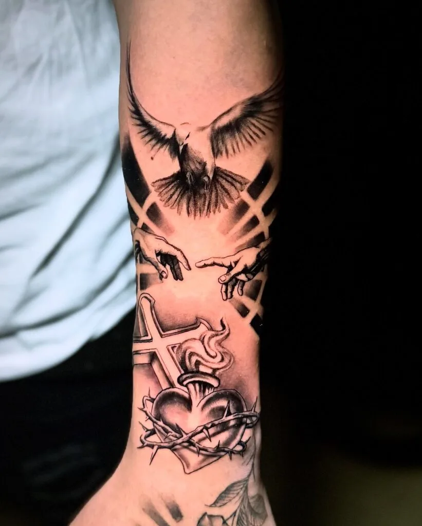 This forearm tattoo combines multiple religious elements into one powerful scene. The dove, a classic symbol of the Holy Spirit, descends from above with open wings, flanked by artistic depictions of the Creation hands reaching toward each other. Below it lies a burning sacred heart entwined with thorns, alongside a cross.