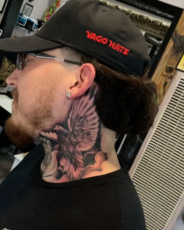 This tattoo spreads across the side of the neck with a majestic dove in full flight, wings reaching upward with motion and energy. The background includes dark, cloudy shading that enhances contrast and makes the dove’s details pop. The careful blending adds depth and gives the image a three-dimensional feel.