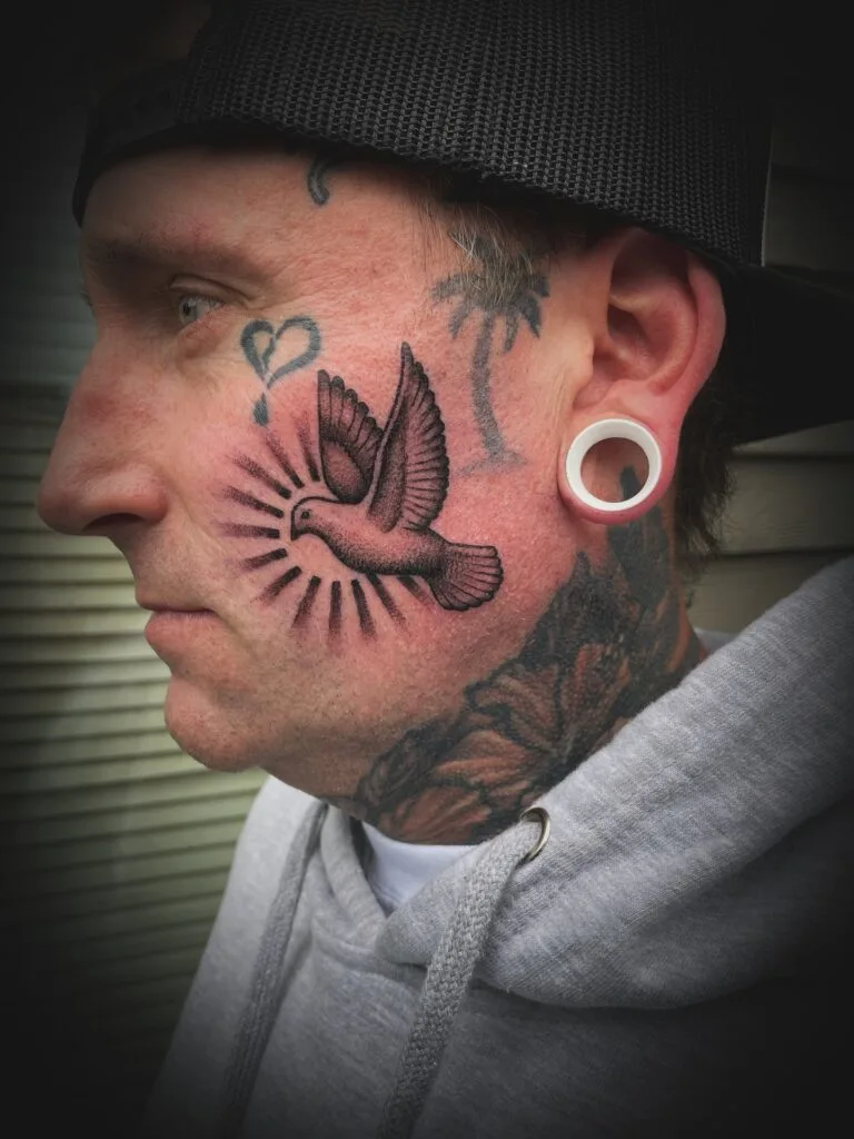 This striking face tattoo features a detailed dove with wings outstretched, surrounded by radiating lines that mimic rays of light. The dotwork shading adds texture and depth, making the bird appear as if it’s glowing against the skin. Positioned on the cheek, it becomes a bold and symbolic centerpiece.