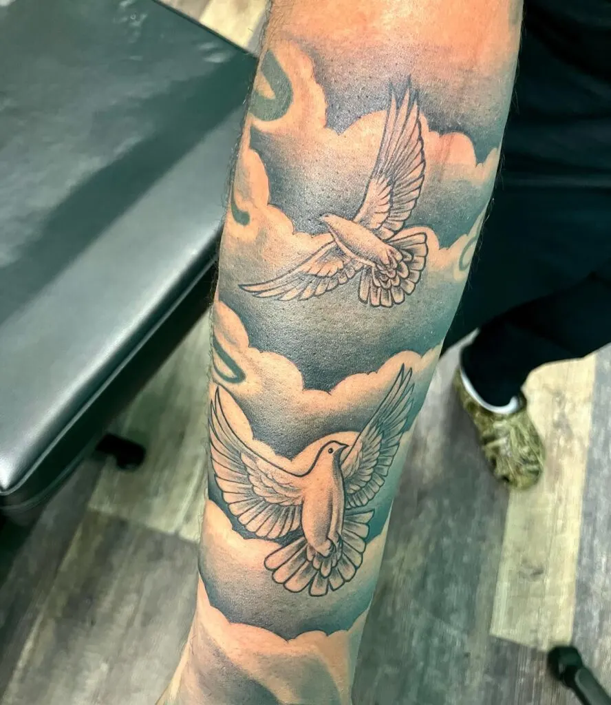 This forearm tattoo features two doves flying upward through shaded clouds, symbolizing hope, guidance, and spiritual ascension. The smooth gradient shading creates depth, giving the illusion of movement and an open sky. The use of negative space enhances the brightness of the birds.