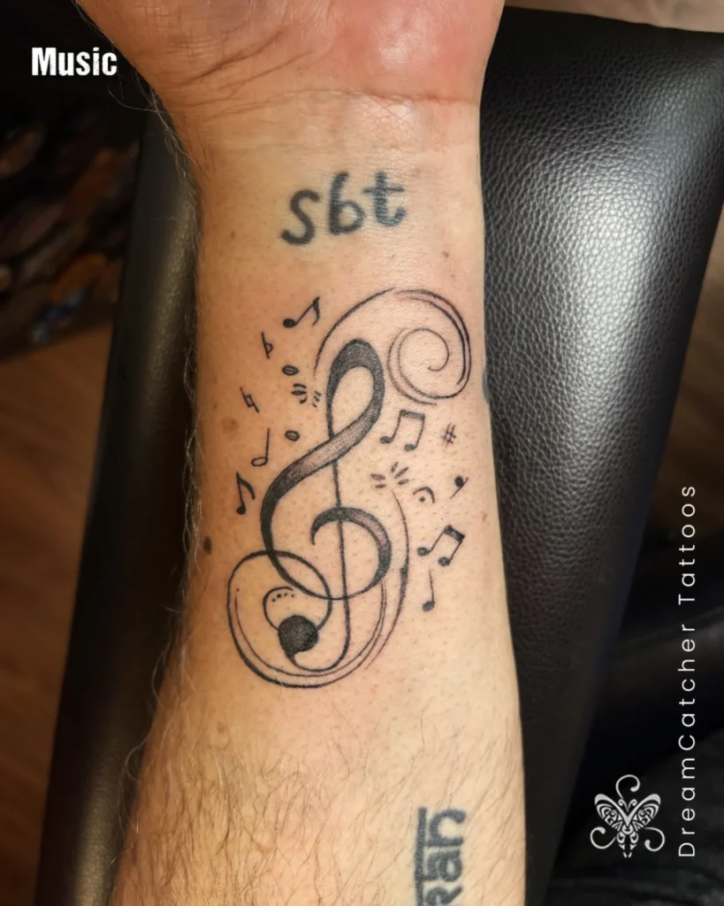 Placed on the wrist, this tattoo is subtle but expressive, perfect for music lovers who want to carry their passion with them everywhere. The fine lines make it elegant, and the simplicity ensures it stays timeless and versatile.