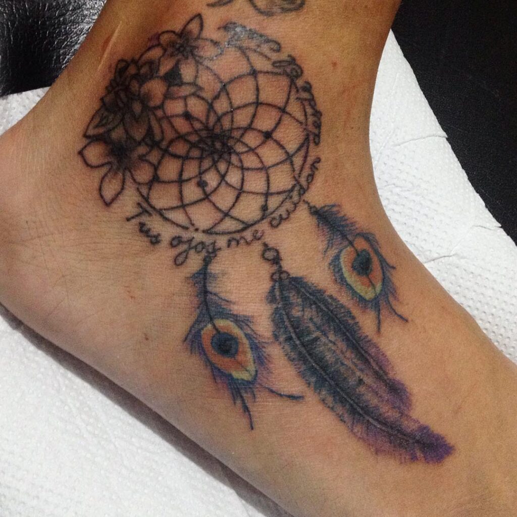 This ankle tattoo is a unique take on the dreamcatcher, featuring peacock feathers with their signature eye-like patterns and delicate purple tips. The dreamcatcher itself is adorned with flowers and a handwritten phrase for a deeply personal touch.