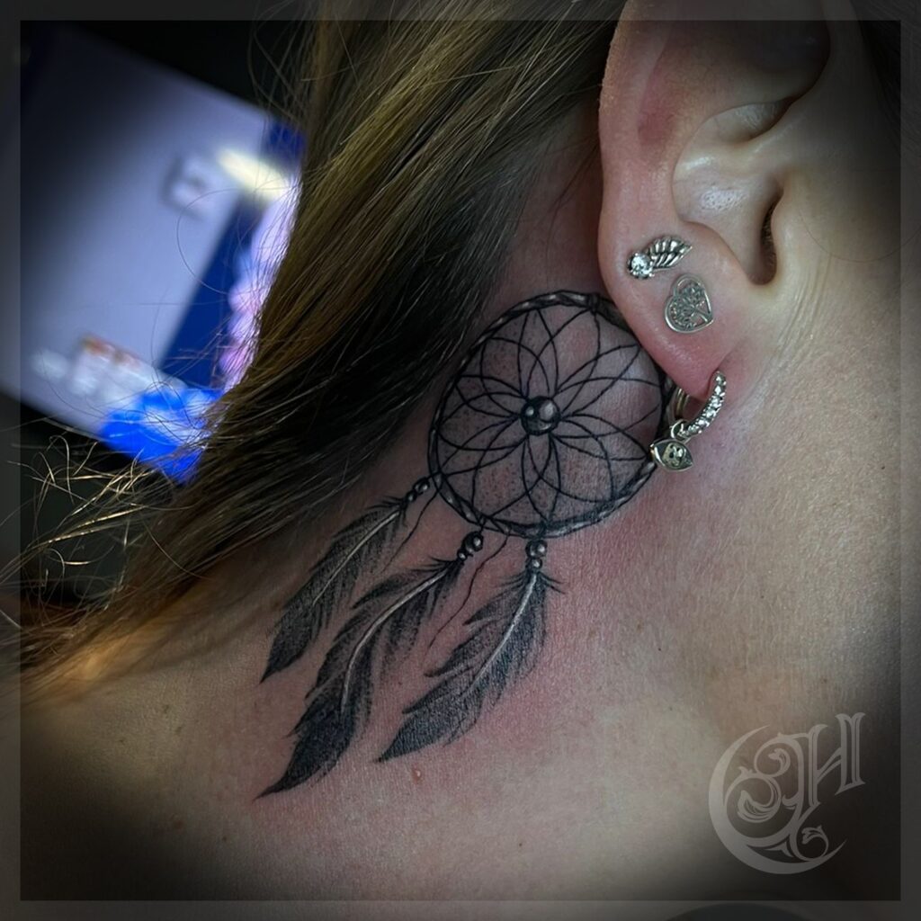 This tattoo is placed just behind the ear, featuring a small yet detailed dreamcatcher with three delicate feathers. Its fine linework and soft shading make it an elegant, subtle choice.