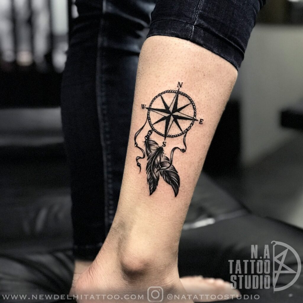 This design blends a compass with a dreamcatcher, turning the web into a directional guide with “N, S, E, W” markings. Two detailed feathers hang below, completing the look.
